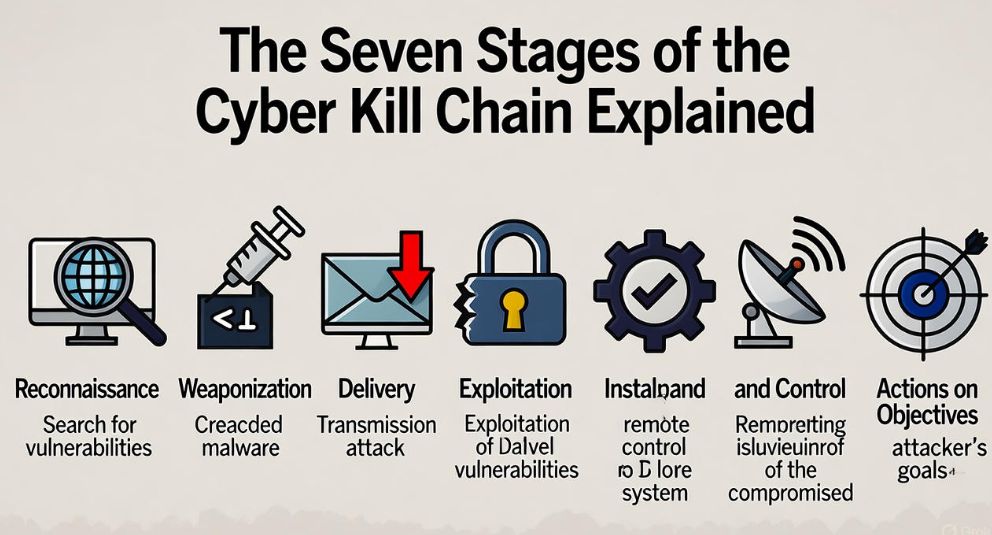 The Cyber Kill Chain delineates seven phases: Reconnaissance, Weaponization, Delivery, Exploitation, Installation, Command and Control, and Actions on Objectives. Below, we delve into each stage with practical examples, defensive tips, and insights updated for 2025’s threat landscape.